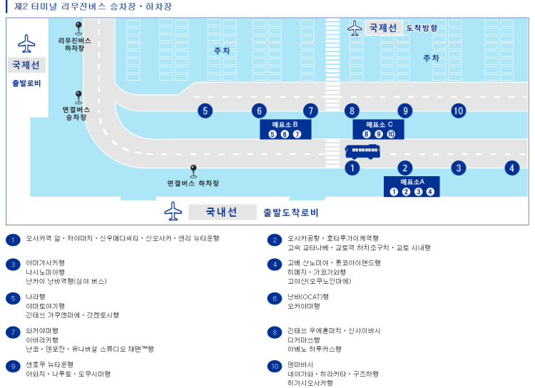 목적지는 난바, 우메다 등 1터미널에서 탑승하는 리무진과 동일하므로 환승의 불편을